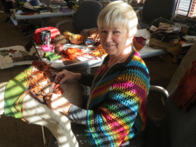 Les étalages colorés des vendeuses, Stephanie Allen-Krauss de Green Mountain Hooked Rugs, Nancy Jewett de Fluff and Peachy Bean Designs, et Rae Harrell Rug Hooking, étaient tout indiqués pour satisfaire à toutes les recherches du matériel idéal. Angela Foote, armée de splendides lainages, a dirigé un cours sur « L’exploration des couleurs dans la tapisserie au crochet ». De plus, il y avait une très grande sélection de cadeaux à gagner dans l’encan des tasses à thé. J’ai même gagné deux fois!